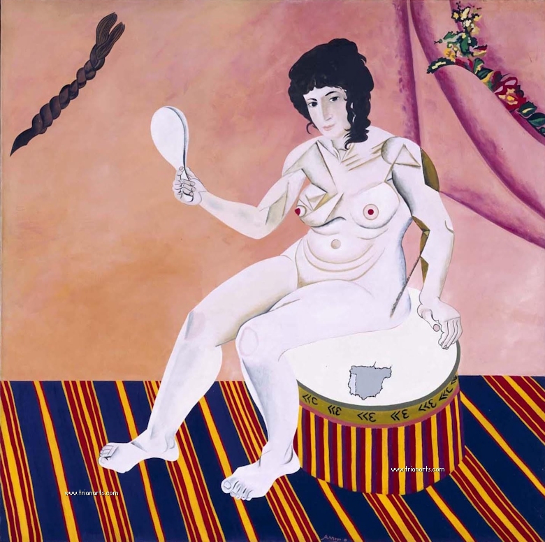 Arroyo vuelve a España y cuelga entre 1976-1977 sus cuadros en las prestigiosas galerías Maeght y Juana Mordó.