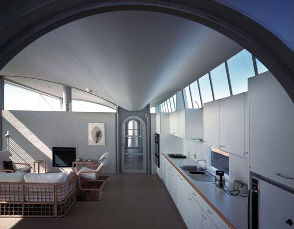 La chapa corrugada y las cubiertas curvas forman una suerte de casa con apariencia de nave industrial, elegante, sencilla y en sintonía con los elementos climáticos y el paisaje.