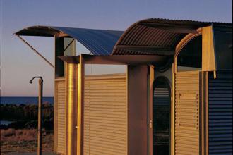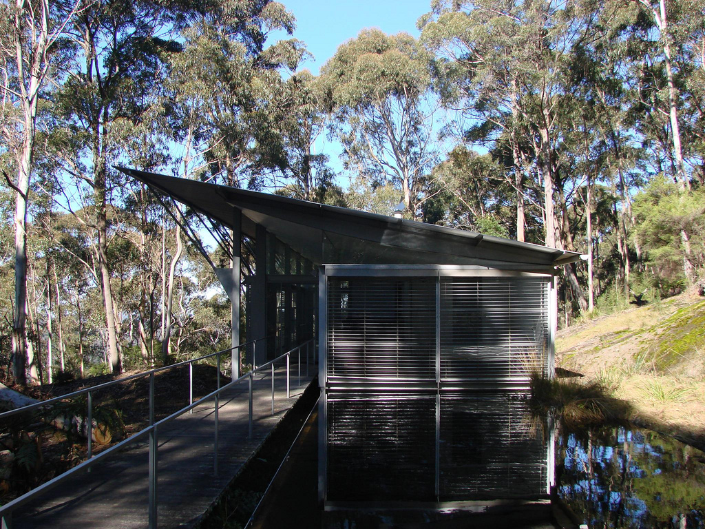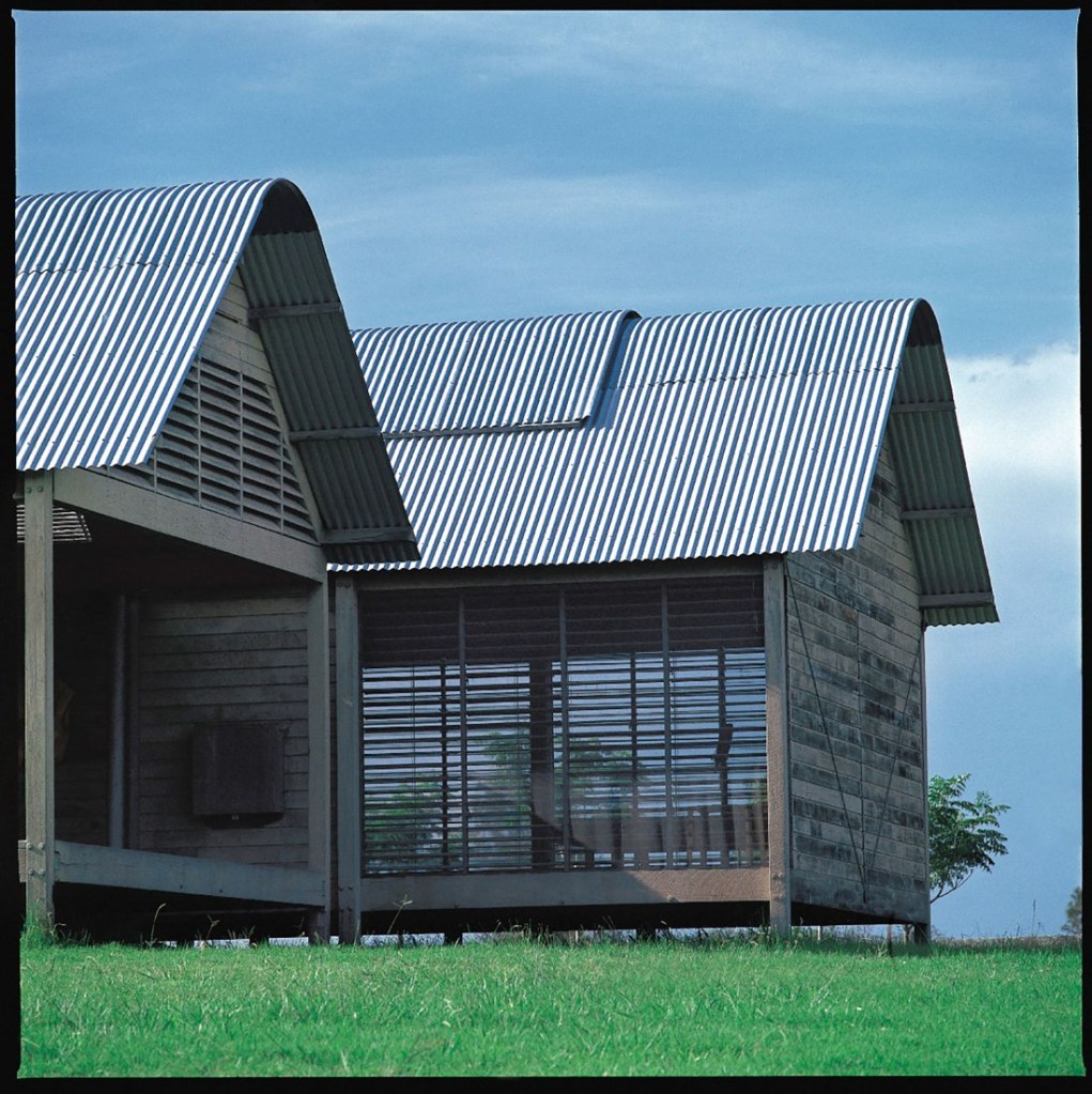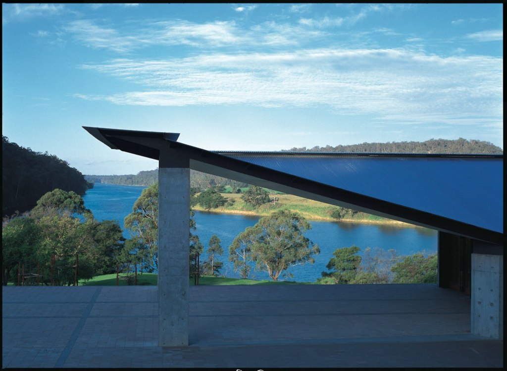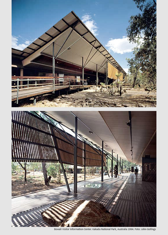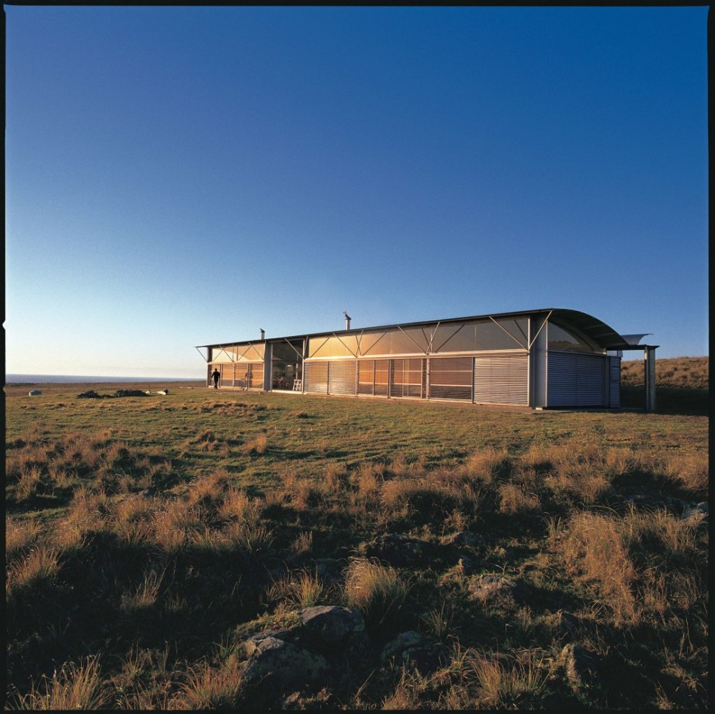 Combina la tradición de las construcciones perecederas de los nómadas aborígenes australianos, con la de los wollsheds, los almacenes para guardar la lana levantados por los colonos en ese país.