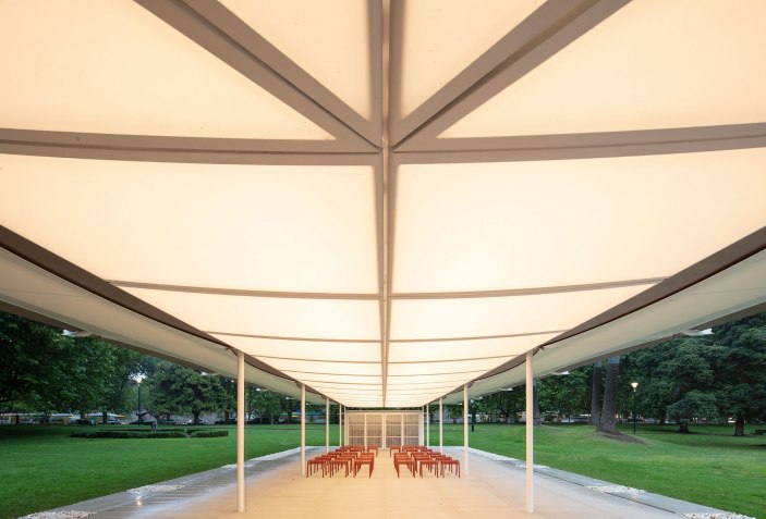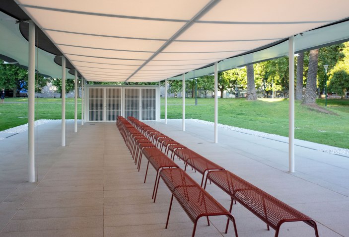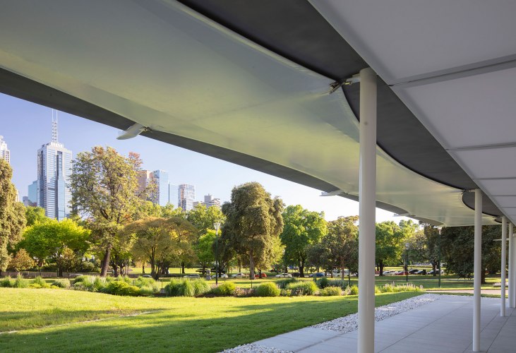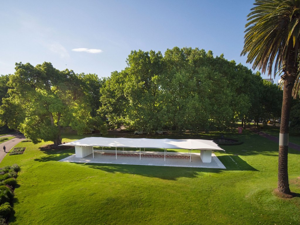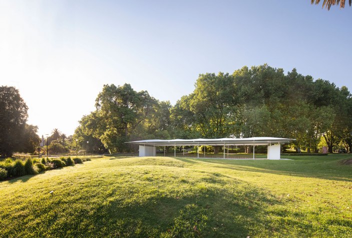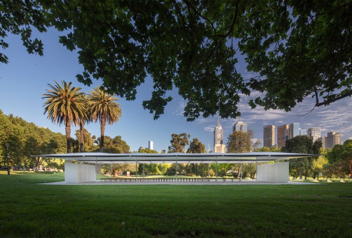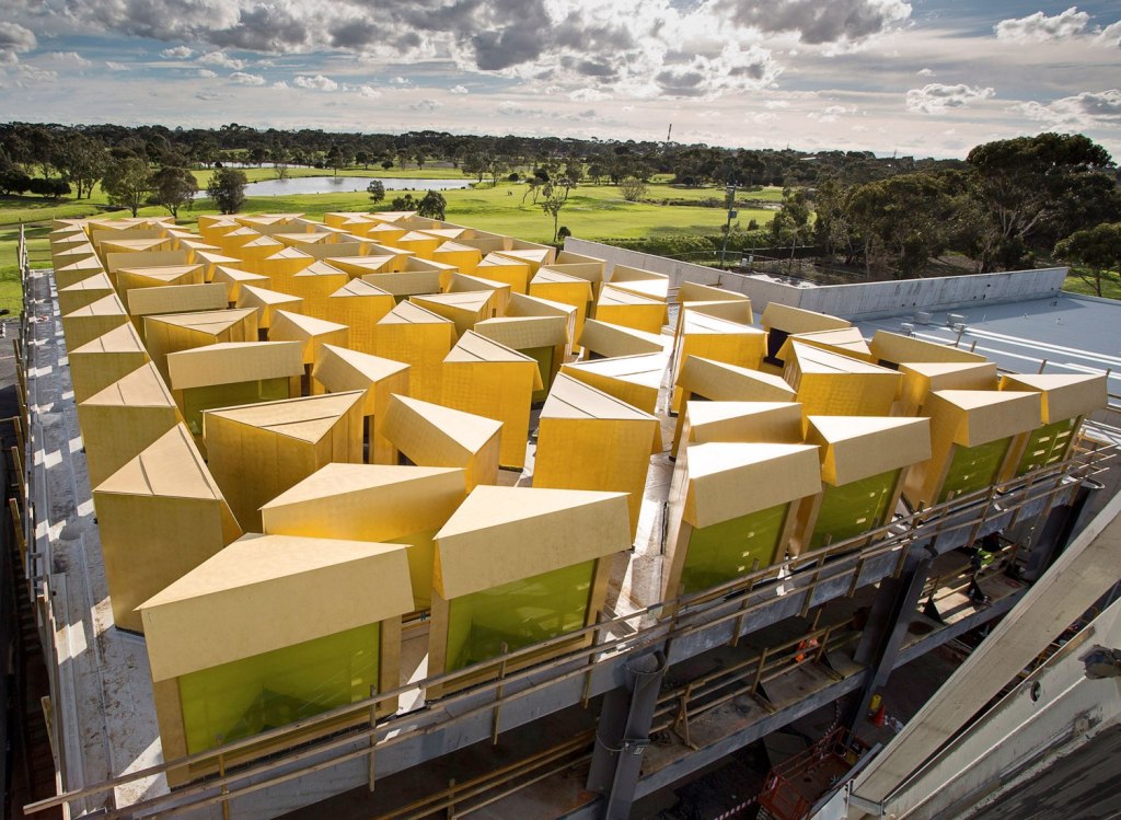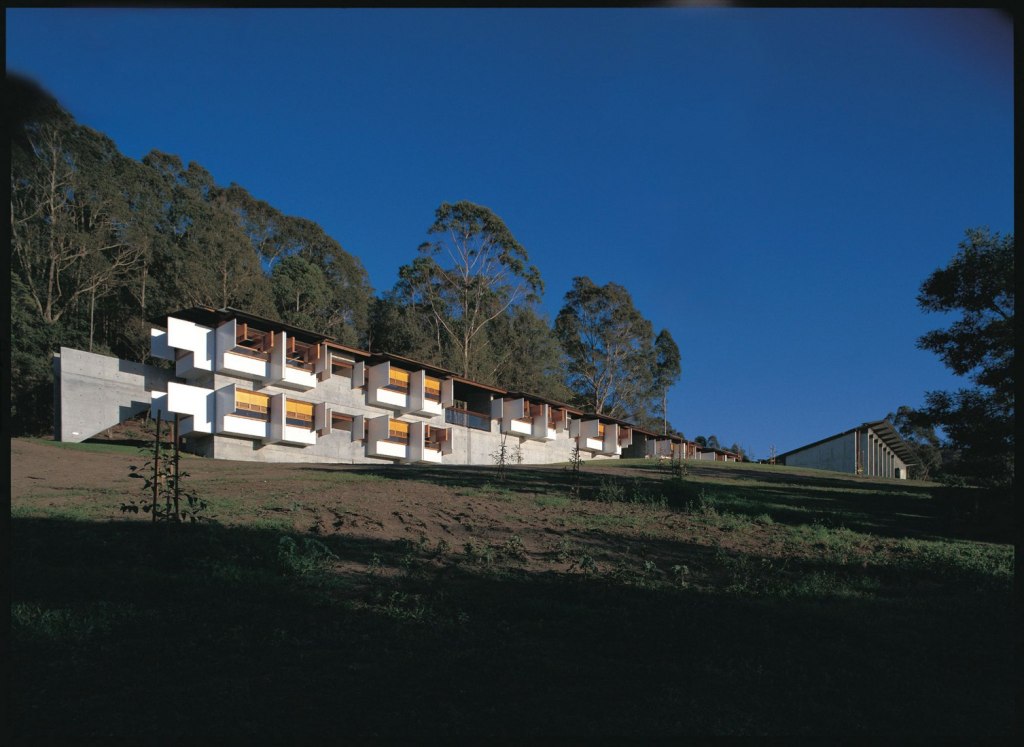 Combina la tradición de las construcciones perecederas de los nómadas aborígenes australianos, con la de los wollsheds, los almacenes para guardar la lana levantados por los colonos en ese país.