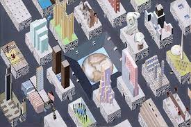 Hay regularidad, hay una trama y cada edificio se corona a su manera, de forma extravagante, aunque él usa muchas referencias desde los bloques de le Corbusier hasta los elementos surreales.