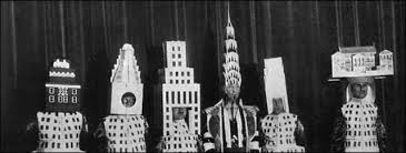 Todos van vestidos igual menos William van Allen, el arquitecto del Chrysler Building decide hacerse su propio disfraz extraordinario que todavía se conserva, y como gorro y caperuza el remate del edificio Chrysler.