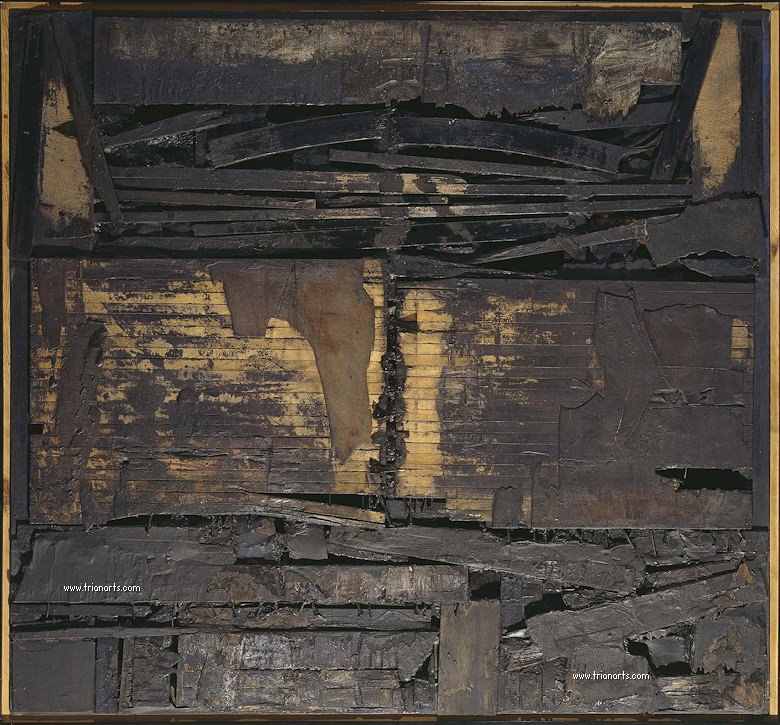 Comienza a explotar las posibilidades del propio soporte, abriendo grietas en la madera con gubias, quemando con sopletes su superficie y levantando las capas superficiales para desvelar la estructura íntima de los tableros armados que utilizaba.