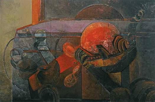 Se atreve con temas duros: la mina, la casa de Poe, la rembrandtiana vaca abierta en canal, el Gólgota… Luego aparecen las ventanas, las calles de la ciudad, las máquinas, las geometrías. Más tarde, las figuras fantásticas, híbridas, de nombres imposibles.