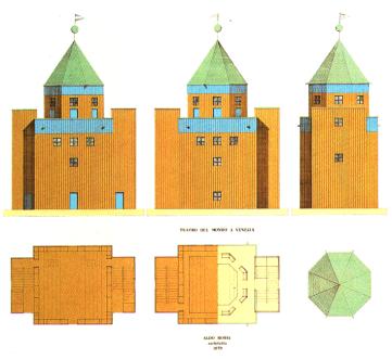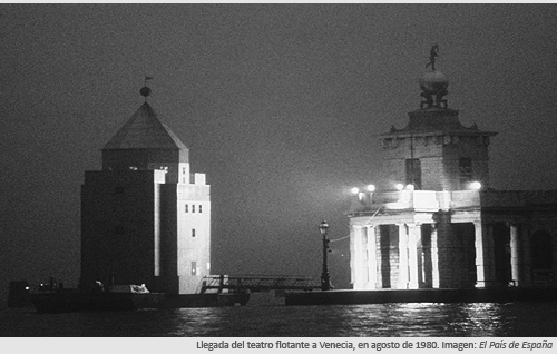 1979 para la Bienal de Venecia, diseña un teatro flotante, el Teatro del Mondo. con capacidad para 250 espectadores sentados alrededor del escenario.