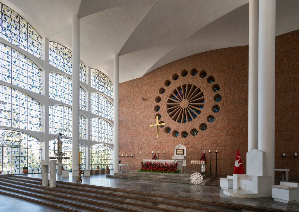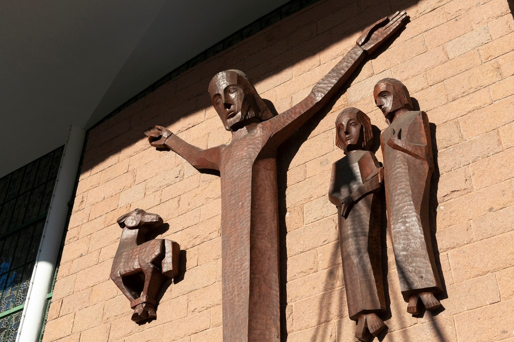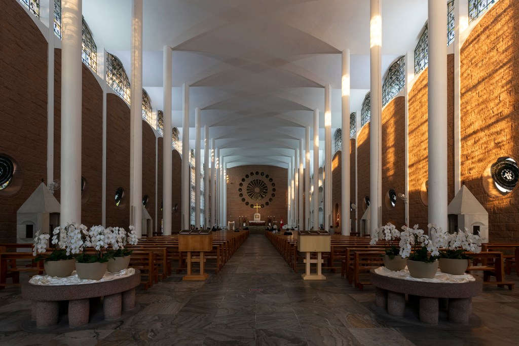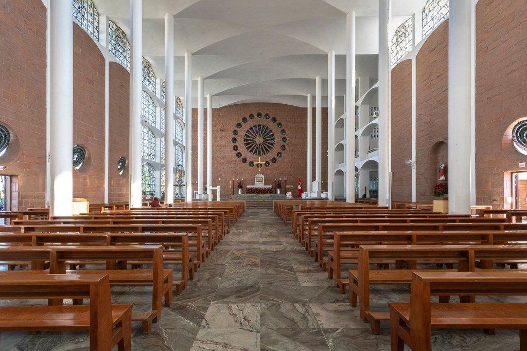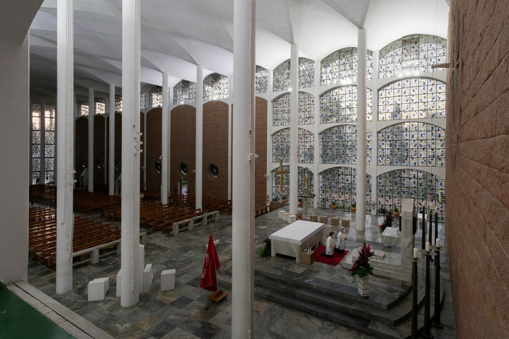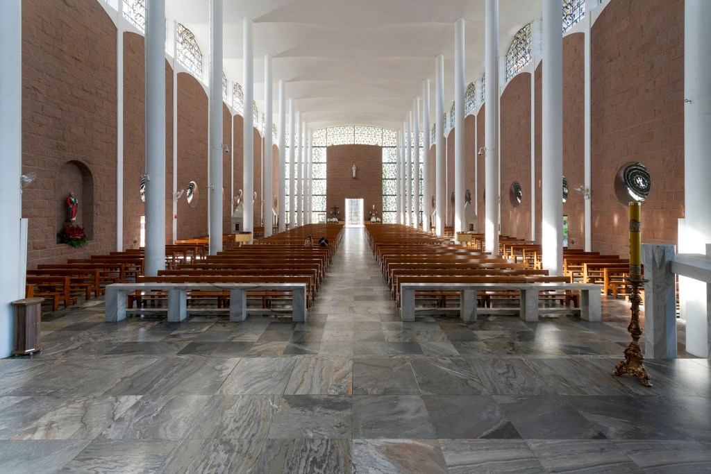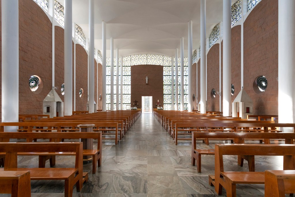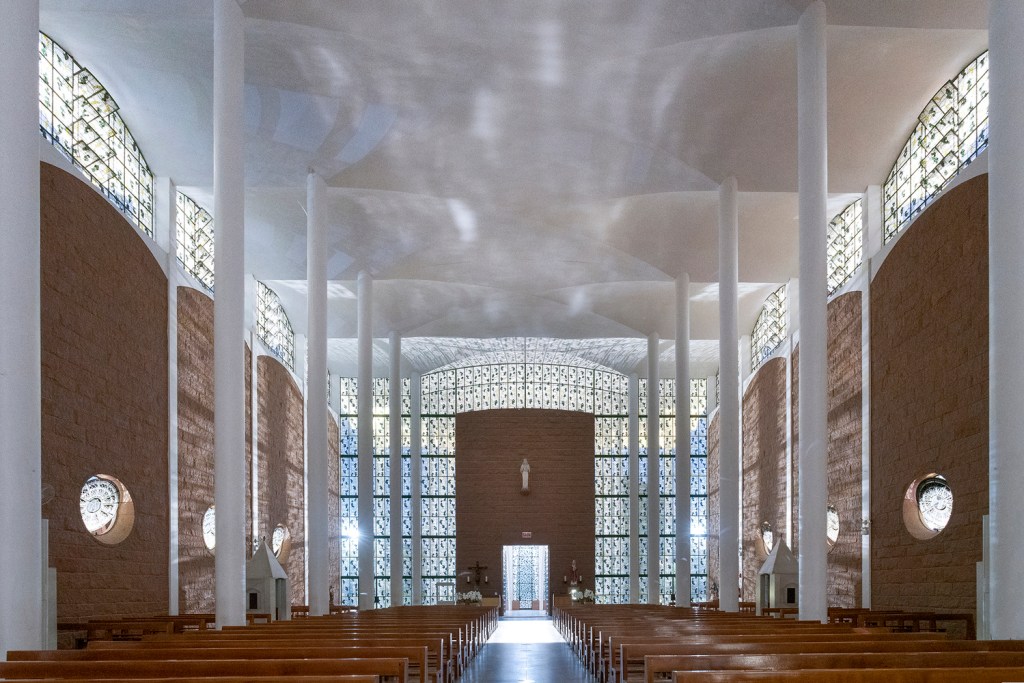 El cristalino bloque de hormigón tallado de la Iglesia María Königin des Friedens (1963-73), que es su obra más famosa pero también la que más críticas le trae por su arcaica rotundidad monumental en tiempos de revoluciones tecnológicas y sociales.