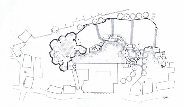 De las gigantescas dimensiones de la iglesia, que puede albergar a 8.000 peregrinos, Böhm deduce la escala y el carácter paisajístico y urbano del conjunto.