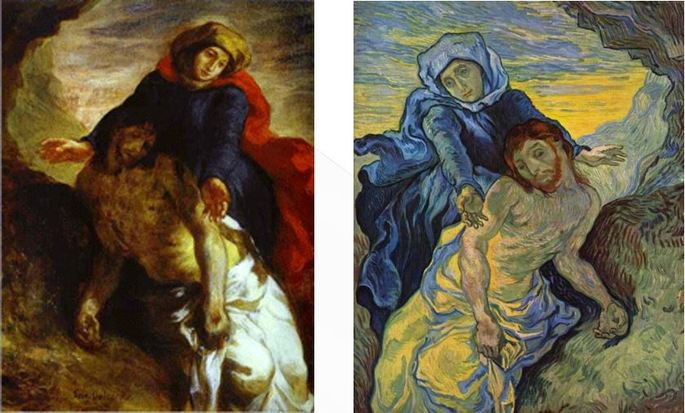 De esta forma explora temas religiosos como La Piedad de Delacroix, donde pinta a Cristo pelirojo y La resurrección de Lázaro de Rembrandt.
