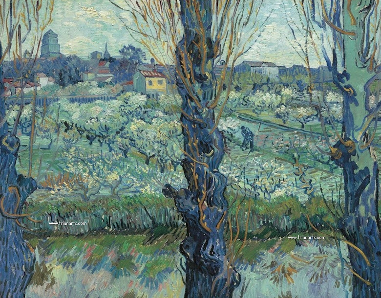 Estoy plenamente absorbido por estas llanuras inmensas de campos de trigo sobre un fondo de colinas, vastos como el mar, de un amarillo muy tierno, un verde muy pálido, de un malva muy dulce, con una parte de tierra labrada, todo junto con plantaciones de patatas en flor; todo bajo un cielo azul con tonos blancos, rosas y violetas. Me siento muy tranquilo, casi demasiado calmado, me siento capaz de pintar todo esto.