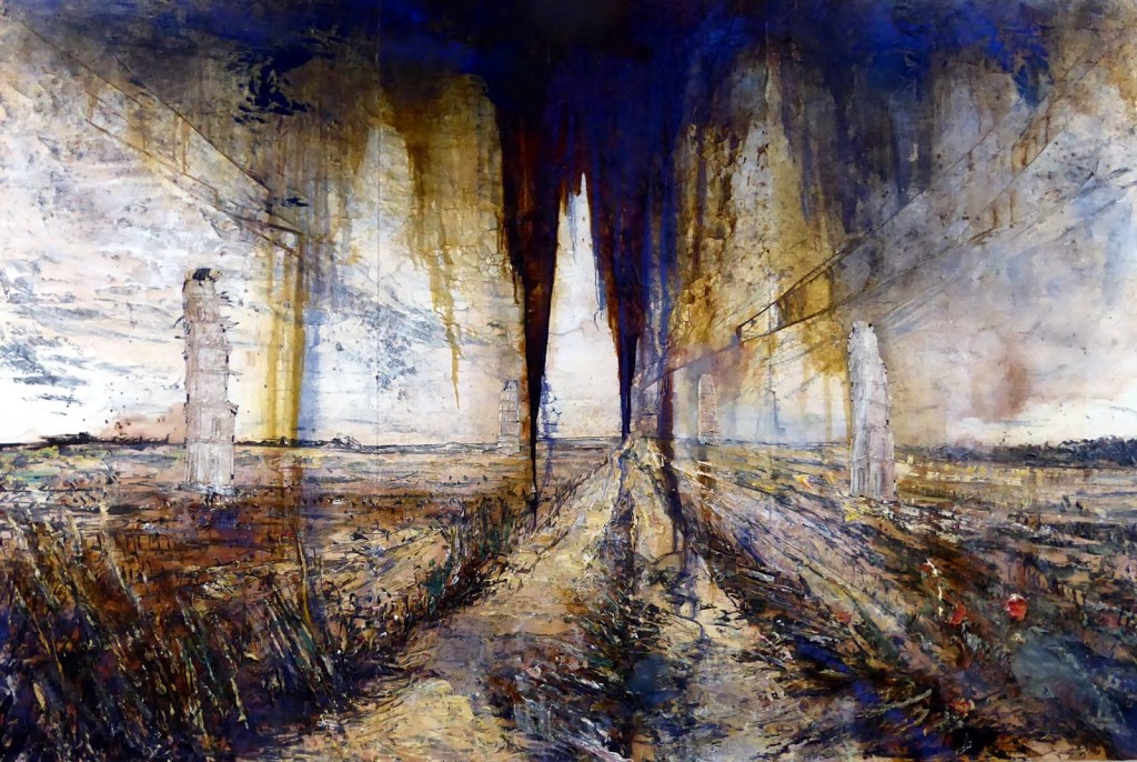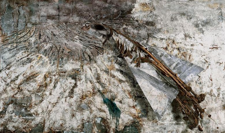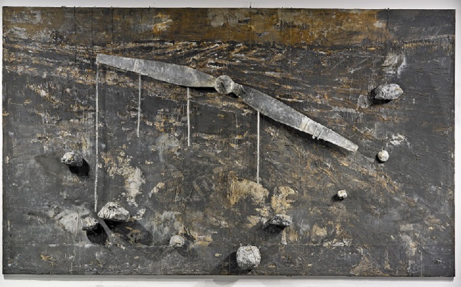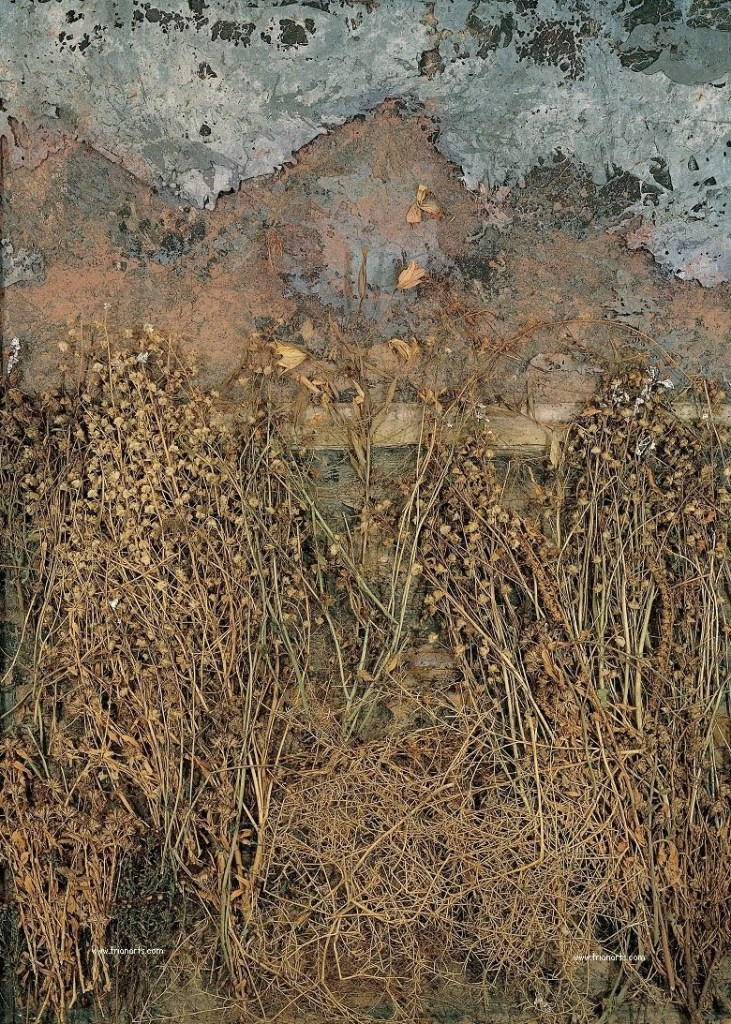 La fuerza de sus pinceladas o la gama de colores prácticamente monocroma se alían con materiales tan dispares como el plomo, la paja, el barro o las plantas.