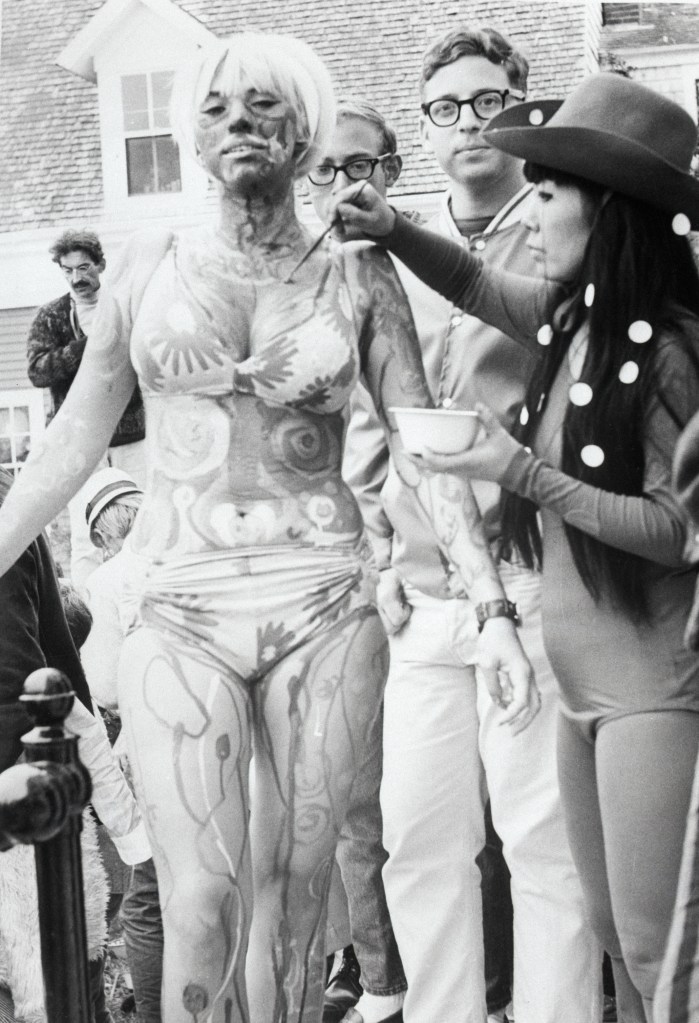 Hippie Martha Melnyk, of Philadelphia, lets New York artist Yayoi Kusama paint her at a Body Festival in Provincetown, Massachusetts.