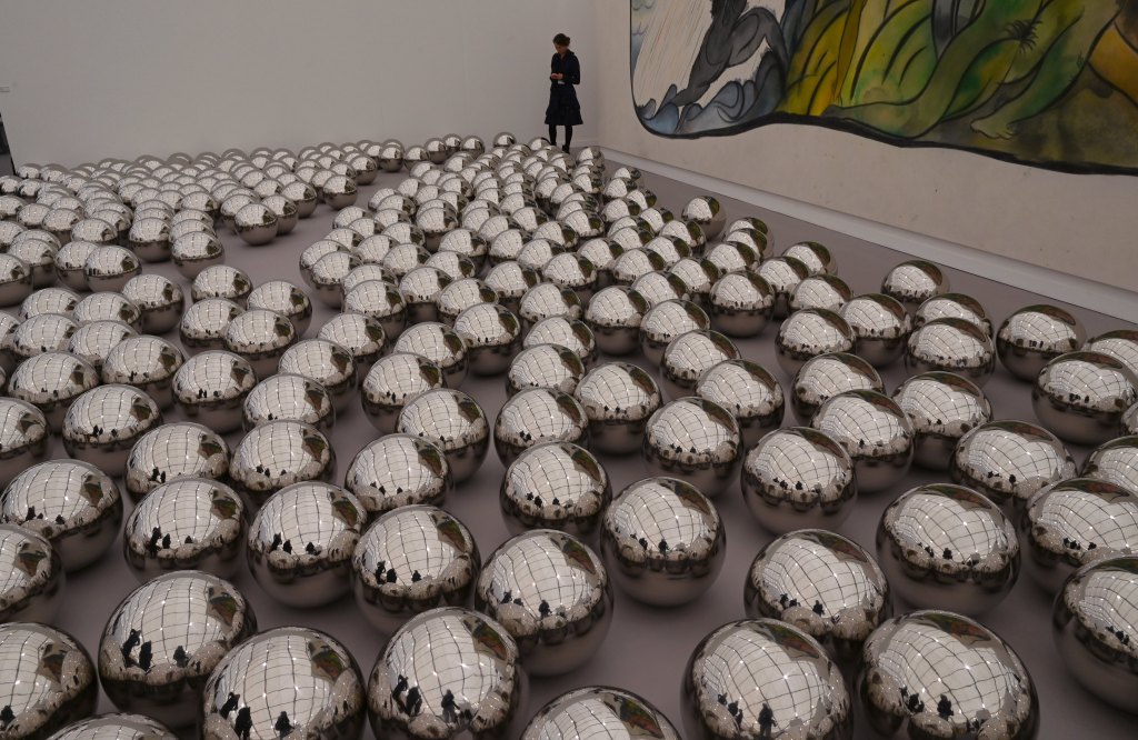 TOPSHOT – A person looks at the art of Yayoi Kusama «Narcissus Garden 1966» during Frieze New York 2019, on May 2, 2019. – The exhibit takes place in Randall’s Island Park May 1-5, 2019. This year, the art fair introduces new collaborations with leading museums directors from institutions across the US. (Photo by TIMOTHY A. CLARY / AFP) / RESTRICTED TO EDITORIAL USE – MANDATORY MENTION OF THE ARTIST UPON PUBLICATION – TO ILLUSTRATE THE EVENT AS SPECIFIED IN THE CAPTION (Photo by TIMOTHY A. CLARY/AFP via Getty Images)