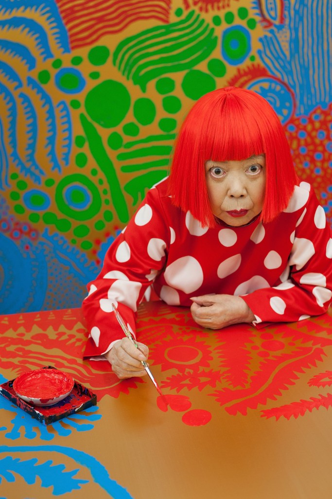TOKYO, JAPAN – JANUARY 25: Japanese artist Yayoi Kusama sits working on a new painting, in front of other newly finished paintings in her studio, on January 25, 2012 in Tokyo, Japan. Yayoi Kusama, who suffers from mental health problems and lives in a hospital near her studio, is one of today’s most highly revered and popular of Japanese artists. She is one of the world’s top selling living female artists breaking records in the millions. A major retrospective of her work is on display at Tate Modern in London through June 5, 2012. (Photo by Jeremy Sutton-Hibbert/Getty Images)