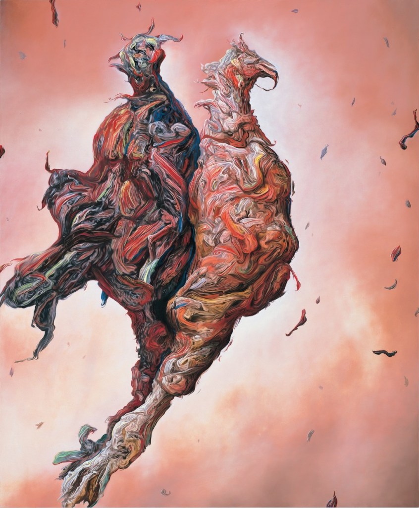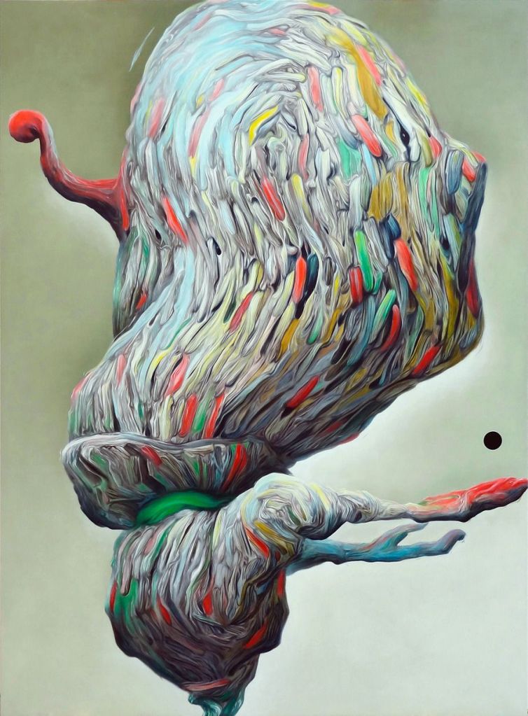 Veo las marcas escultóricas del pincel como un desafío a la lógica de la pintura en el sentido de que parecen desafiar la gravedad manteniéndose erguidas. Para mí, existen dentro de un mundo surrealista que se basa en en conseguir que la pintura haga algo que no debería hacer y en sentarse en un mundo tridimensional en el que no debería estar.