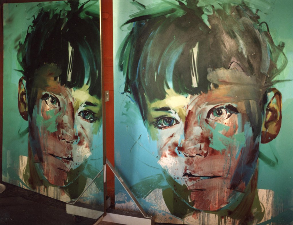 Sus pinturas suelen ser mucho más grandes que el tamaño natural, por lo general de seis por seis pies o más.