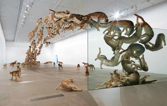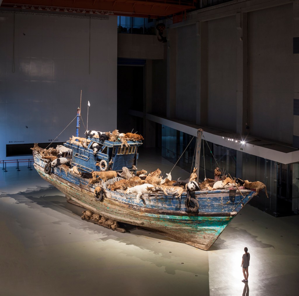 Las réplicas de los 99 animales creados con lana y piel de cabra, entre los que se encuentran pandas, elefantes o cerdos enfermos o incluso moribundos, actúan como alegoría de la situación del planeta por deterioro del medio ambiente.