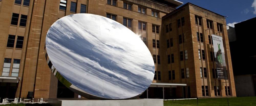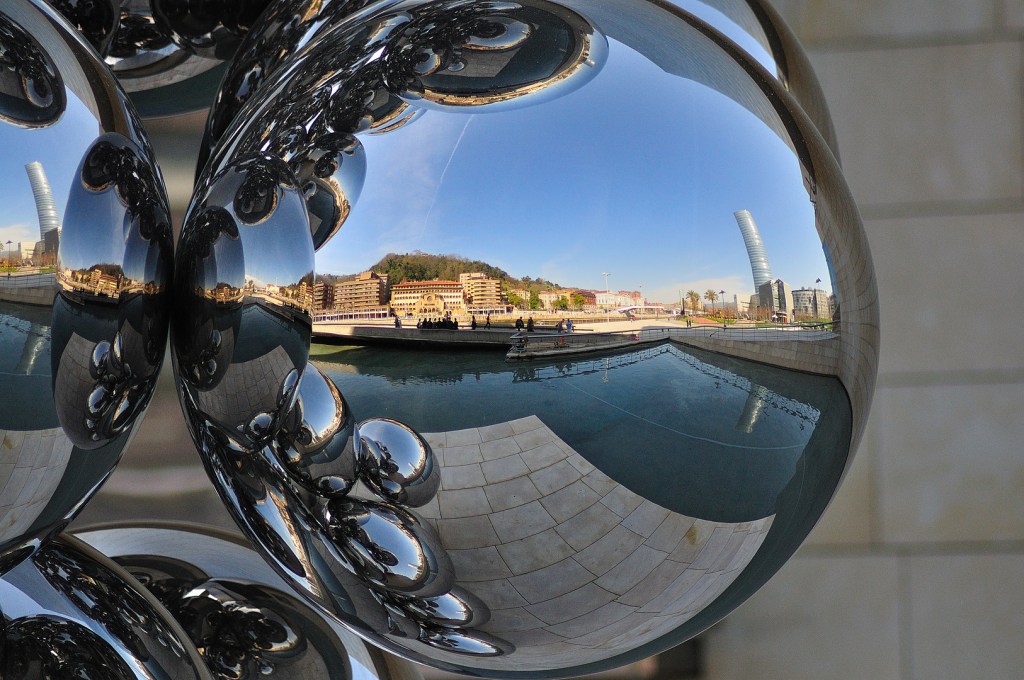 Creada a base de placas de acero inoxidable, muy pulidas, se convierte en un gigantesco arco que refleja y distorsiona a la vez el entorno en el que está.