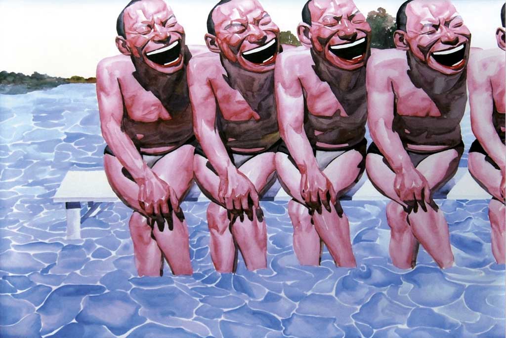En Noah’s Ark, seis de los autorretratos de Yue están sentados en un pequeño bote de remos en un mar azul, sentados juntos en cuclillas, agarrando sus rodillas y gritando en una risa silenciosa.