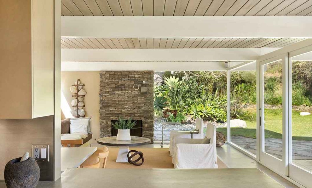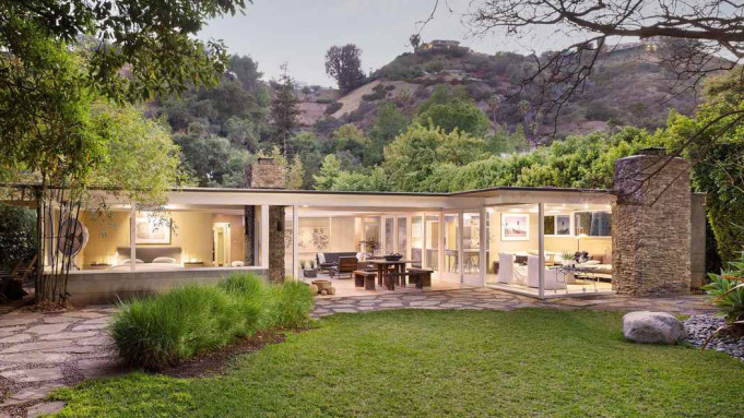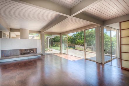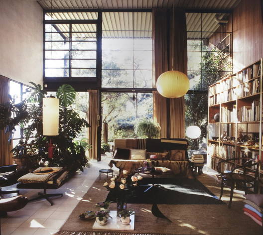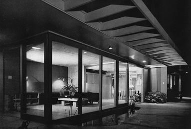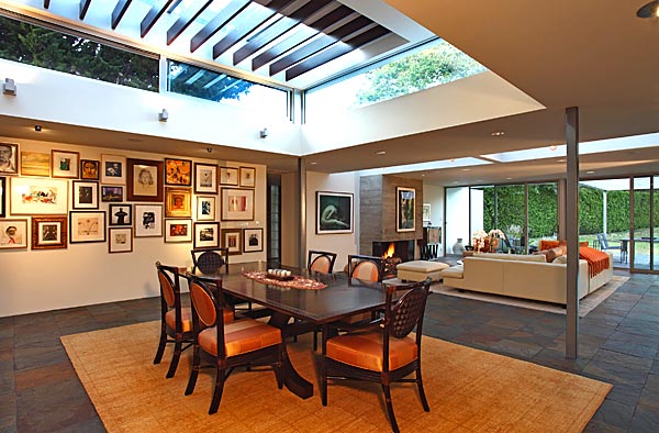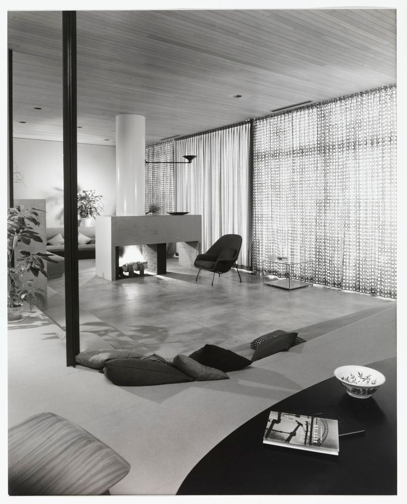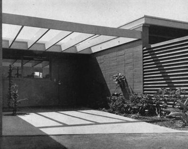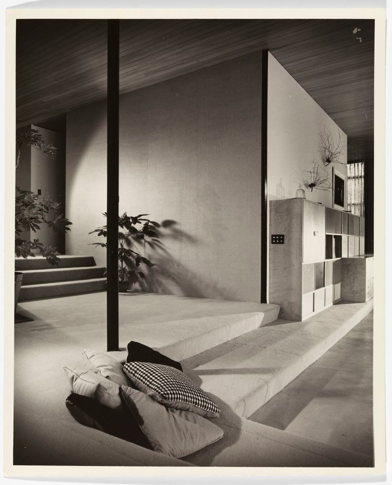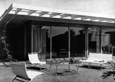 1945-1948 con los cristales hasta el techo, la Case Study House n.° 7 de San Gabriel, California, de una sola planta y construida con bloques de hormigón, presenta la particularidad de una luz cenital sobre un espacio con plantas del interior de la casa.