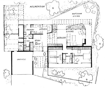 La casa está situada en una parcela horizontal irregular. Las necesidades de la familia eran los de una típica familia pequeña. Gente activa con una hija pequeña; el padre, aficionado a la fotografía, necesitaba un lugar para estudiar y trabajar cuando estába en casa; la madre, interesada en la cocina, costura y jardinería, y también con intereses musicales junto con la hija pequeña. Los requisitos debían cumplirse con un mínimo de costo, pero con la máxima flexibilidad y amplitud, y con un aprovechamiento máximo de la vida interior y exterior.