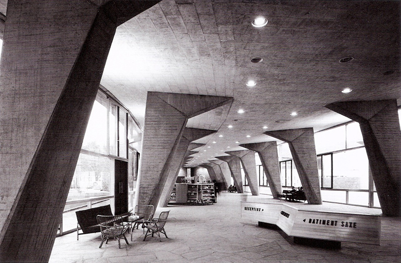 Originalmente, el área de la planta baja esta acristalada en torno a los apoyos inclinados de hormigón de siete metros de altura.