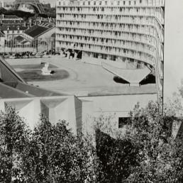 Tras un primer proyecto duramente criticado y destinado a otro emplazamiento, los arquitectos presentan la propuesta para el complejo entre 1955-1958.