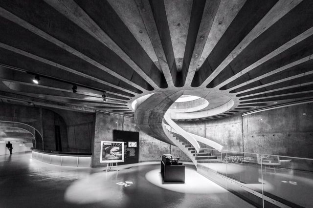 Las fachadas largas presentan travertino pulido, granito rugoso y superficies de vidrio características de todo el complejo que vive del estímulo de los contrastes de formas y materiales.