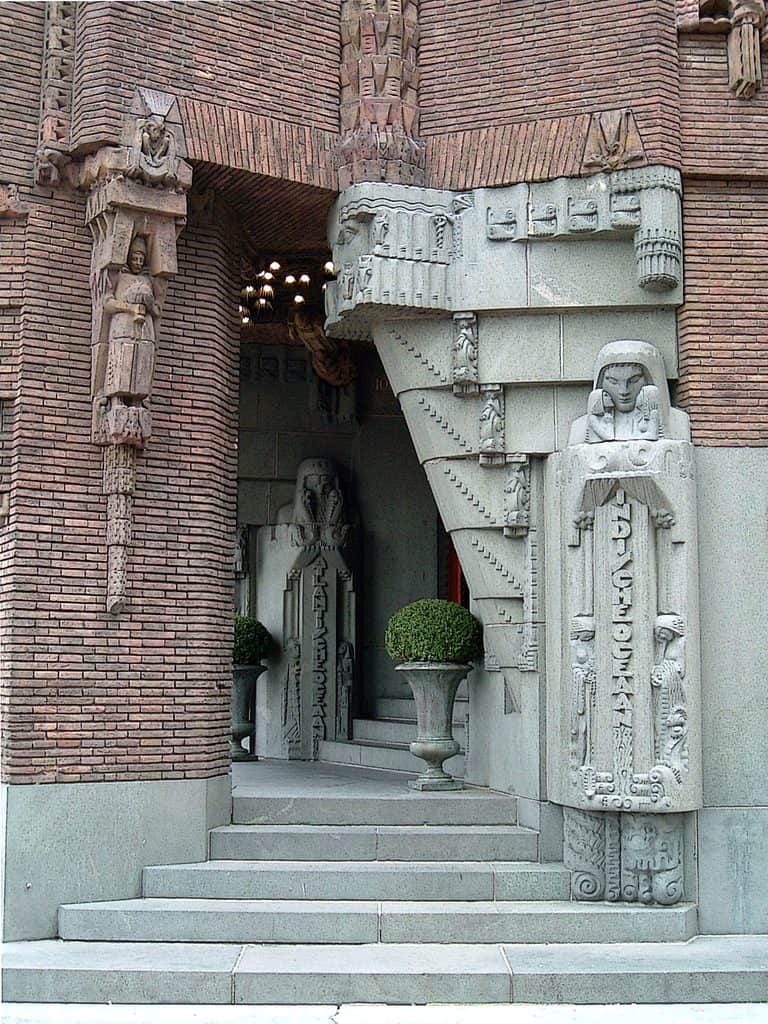 Las esculturas generalmente figurativas se integran en estos edificios de ladrillo.