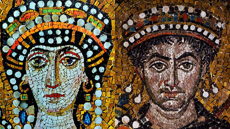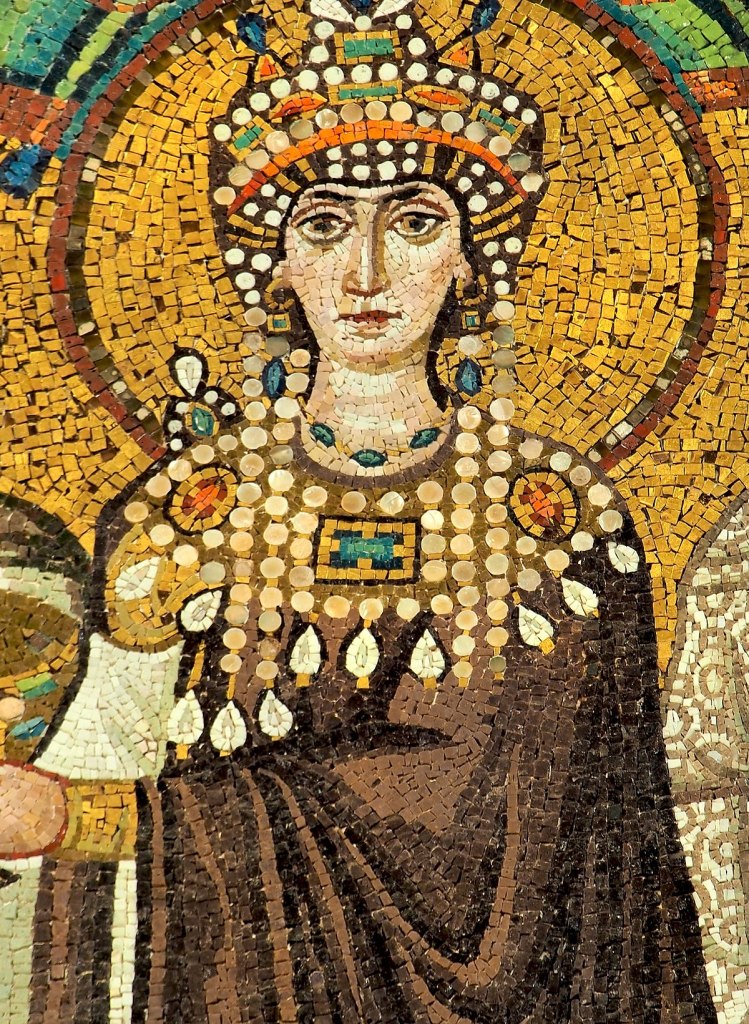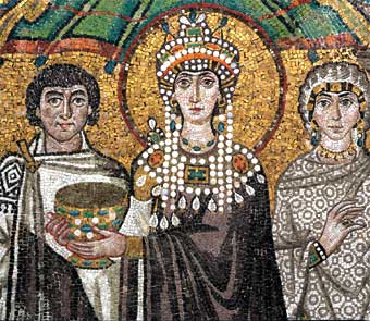 La única imagen de la emperatriz Teodora esta en Ravena, con los ojos oscuros muy grandes y la cara estrecha.