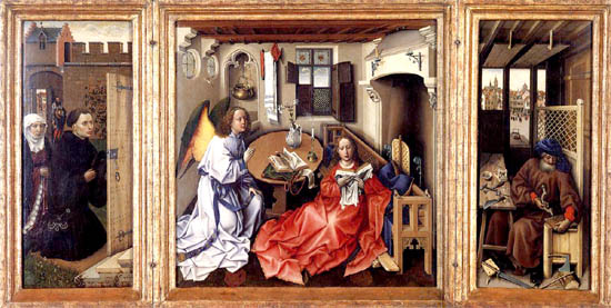 Los primeros paneles de Campin muestran la influencia de los principales artistas góticos, pero muestran observaciones más realistas que logró mediante innovaciones en el uso de pinturas al óleo.