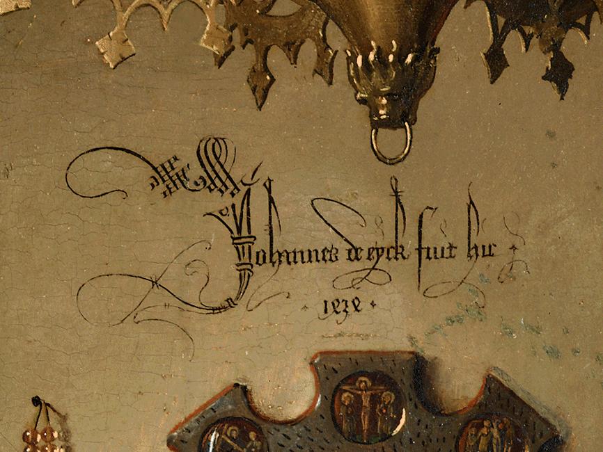 No pone Johann de Eyck fecit (lo hizo), sino fuit hic (estuvo allí, estuvo presente).