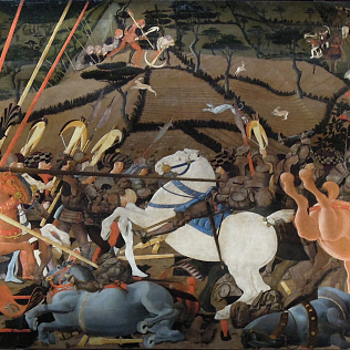 La batalla de San Romano se compone de tres momentos: Niccolò Mauruzi da Tolentino en la batalla de San Romano (c. 1438-1440); Niccoló Maurizi da Tolentino desmonta a Bernardino della Carda en la batalla de San Romano (c. 1435-1455) y El contraataque de Michelotto da Cotignola en la batalla de San Romano (c. 1455).