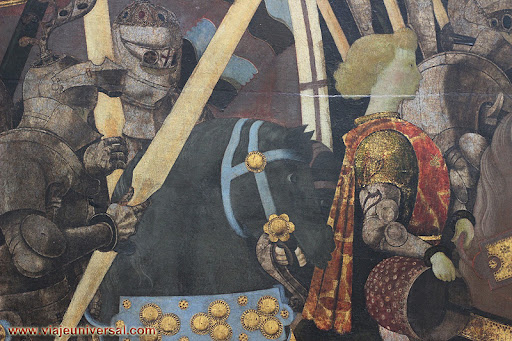 Behind Tolentino is the squire who wears his chief’s helmet and also appears dressed in an elegant suit, so this representation exalts the figure of the condottier and his army.