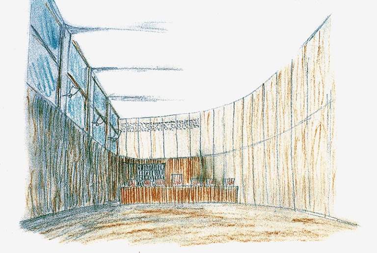 Cuando los proyectos de esta obra, tras muchas revisiones, llegan a la fase de ejecución, se estudia las cuestiones de espacio y abandona la idea de cubrir el techo con una cúpula y opta por una forma cilíndrica para la gran sala.