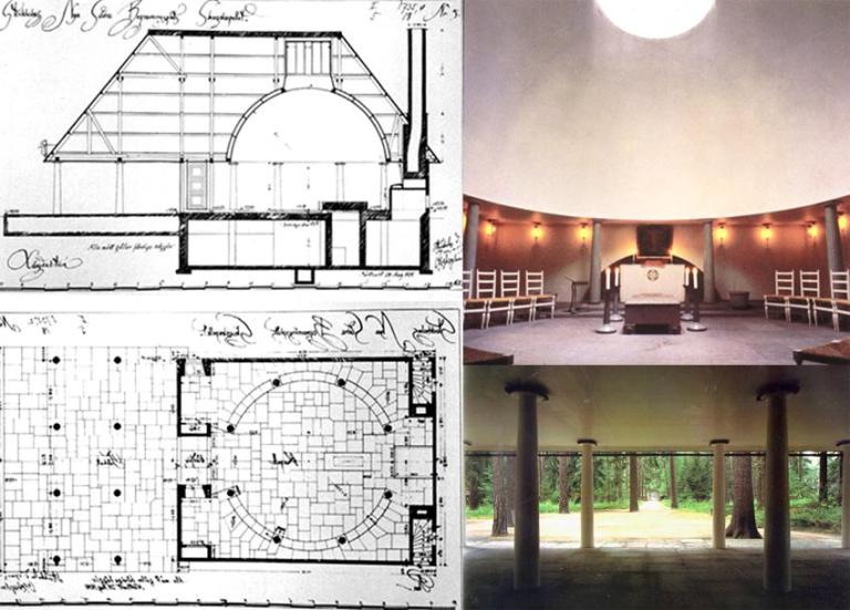 Es un espacio vernaculoso y romántico debido a sus columnas dóricas, se usan cubiertas inclinadas y materiales tradicionales. Asplund busca y genera una compresión-dilatación antecediendo el porche, de apenas dos metros de altura libre, a la cúpula interior, de siete, la cual se ilumina desde el cenit.