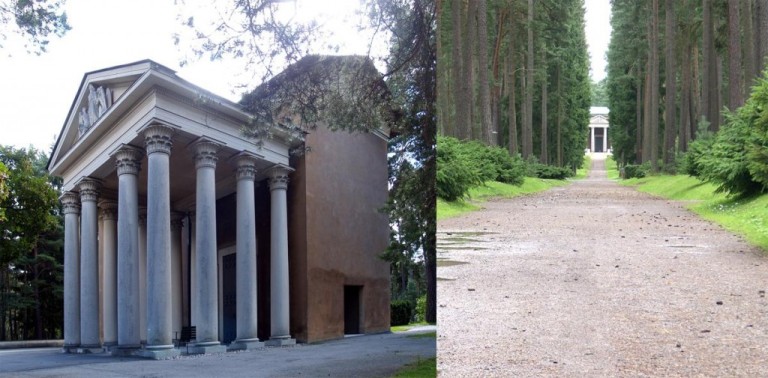 Al alejarse esta el Camino de las Siete Fuentes, casi 1000 metros bordeados de abetos, el único camino recto hasta llegar al claro donde se vislumbra la Colina de la Meditación, que es el lugar más elevado del conjunto.