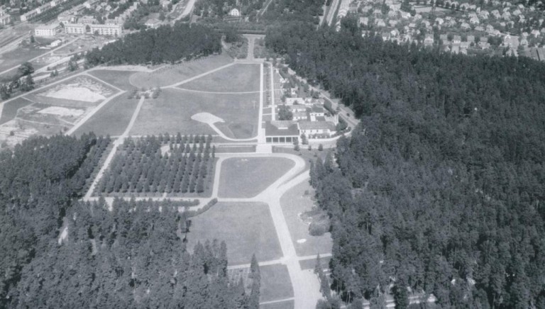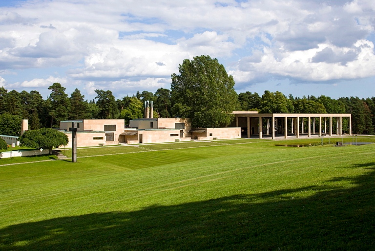 Para ello se hace un concurso internacional de arquitectura en 1914, donde en 1915 se elige el diseño Tallum (pinar) de Asplund y Sigurd Lewerent, que conserva el medio natural donde se va a construir el espacio, ubicando los edificios en espacios libres de árboles.