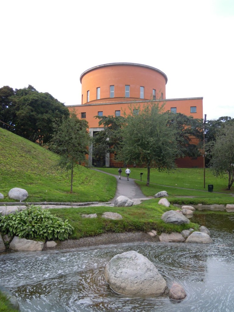 Su forma cilindrica destaca sobre el resto de la arquitectura. Cuenta con una sala central de tres alturas, formado por cuatro salas donde se clasifican los libros por género, además de una zona internacional con libros de distinto idioma. Está rodeada por un parque con estanque y tres anexos planificados por Asplund.