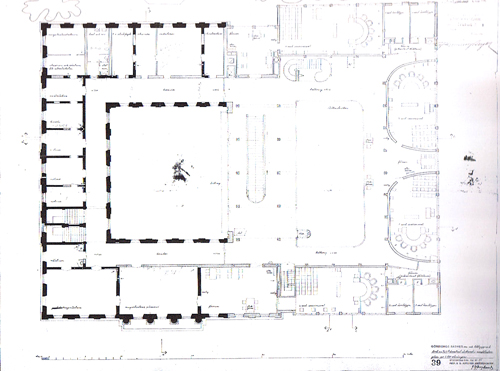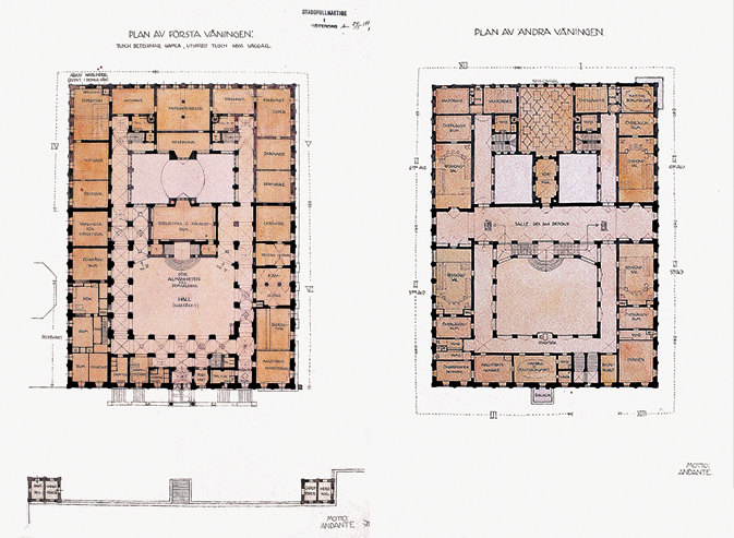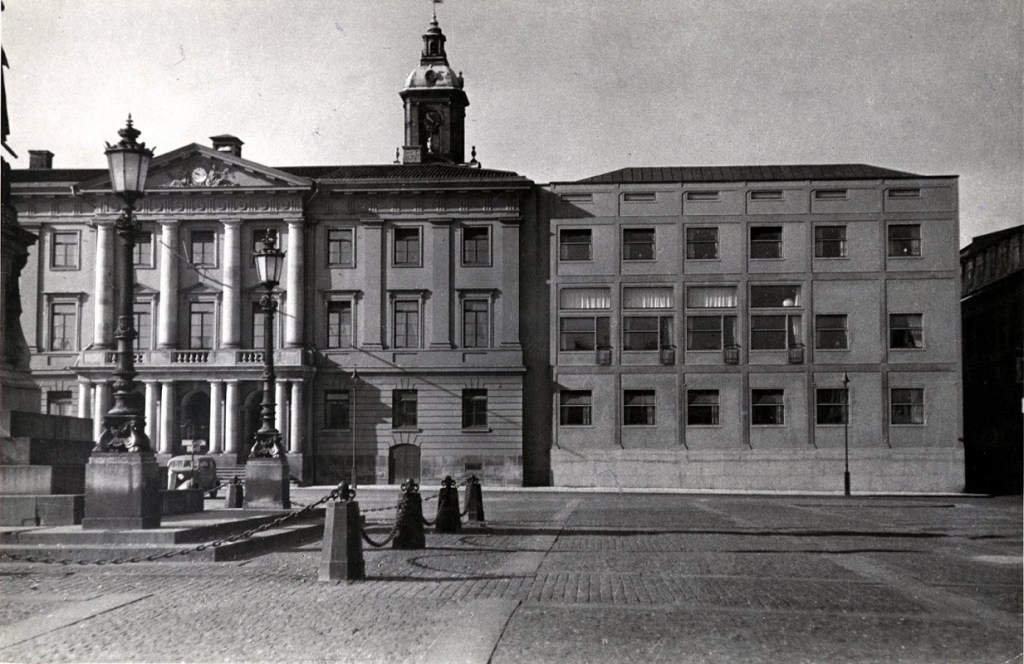 Las palabras de Asplund son que la ampliación consiste en un nuevo cuerpo en forma de U dirigido hacia el viejo patio.