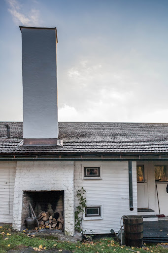 Su cubierta es picuda recordando a los abetos que la rodean y los propios troncos recortados contra el techo del porche de la entrada se mezclan con las 12 columnas de madera.
