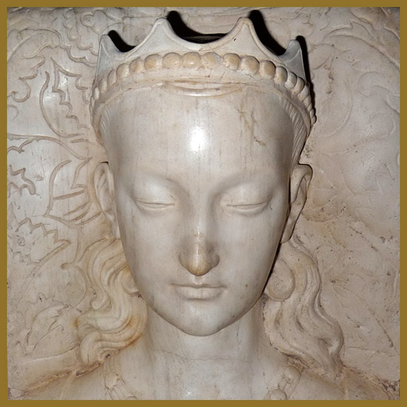 Aparece una mujer muy hermosa y elegante, de piel blanca y perfecta, frente muy ancha y con corona de perlas y pedrería sujetando un velo transparente.