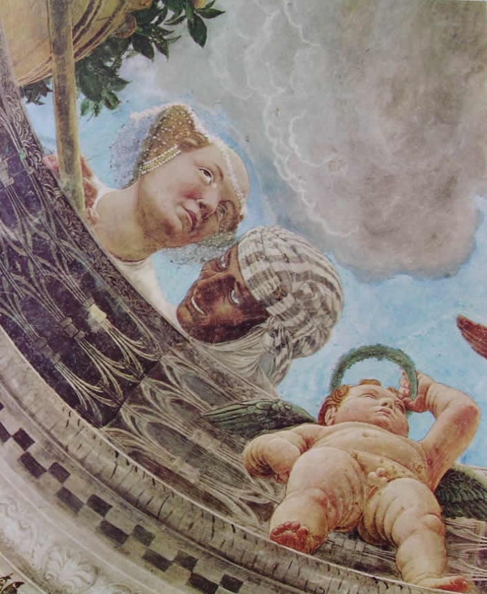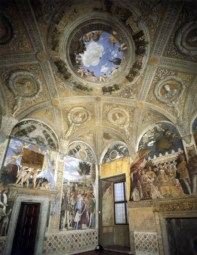 Mantegna transforma la pequeña habitación interior en un elegante pabellón al aire libre, a la que los ocupantes reales y ficticios de la habitación (en realidad una y la misma, ya que los espectadores deben haber sido miembros de ese tribunal) son transportados desde las profundidades de una esencia medieval urbana castillo.