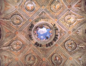 El mecenazgo de Gonzaga proporcionó a Mantegna una renta fija (que no siempre se materializó) y la oportunidad de crear lo que se convirtió en su obra superviviente más conocida, la llamada Camera degli Sposi en elPalazzo Ducale en Mantua .