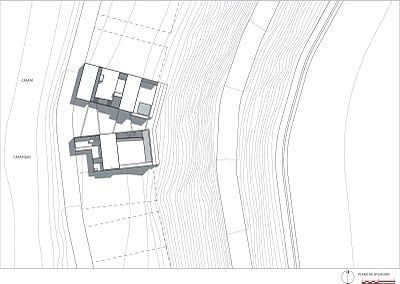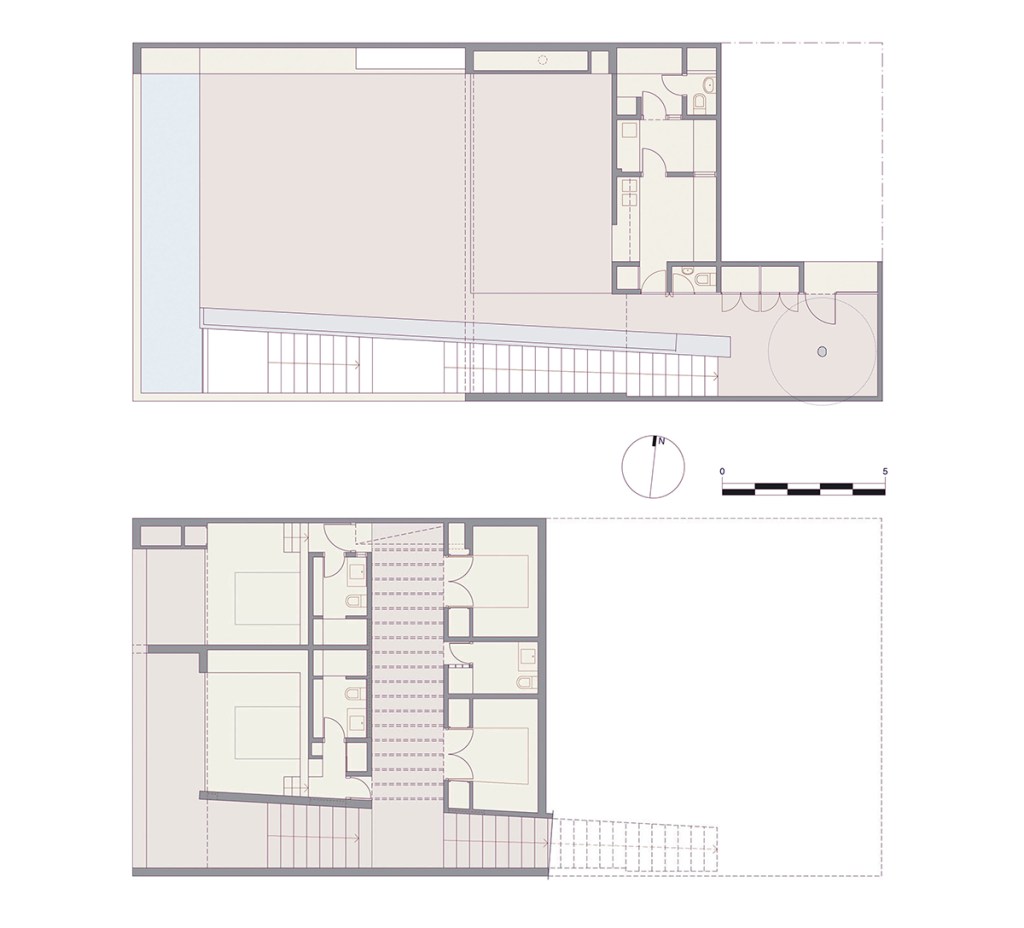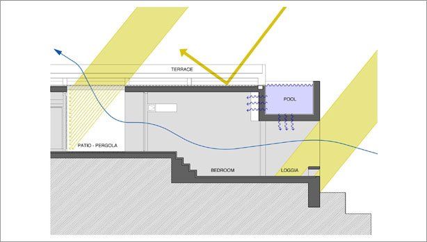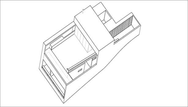 Una escalera abierta sigue la topografía natural y conduce al nivel del dormitorio debajo de la terraza. Las habitaciones de los niños son accesibles a través un patio/pérgola, cubierta por la terraza. El dormitorio de los padres se ubica al final de la escalera, pasando por debajo de la piscina suspendida.