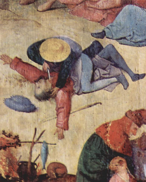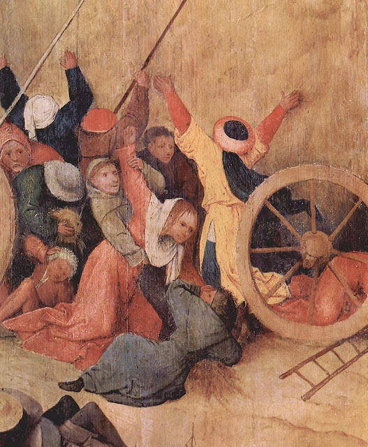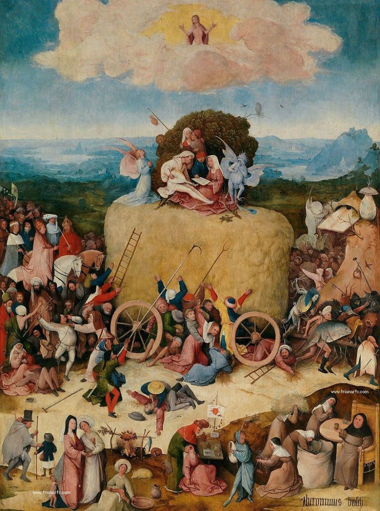 Bajo la atenta mirada de Cristo Redentor, todos los estamentos quieren coger un puñado de ese heno, incluido el clero, que aparece aquí censurado por vicios como la avaricia y la lujuria.