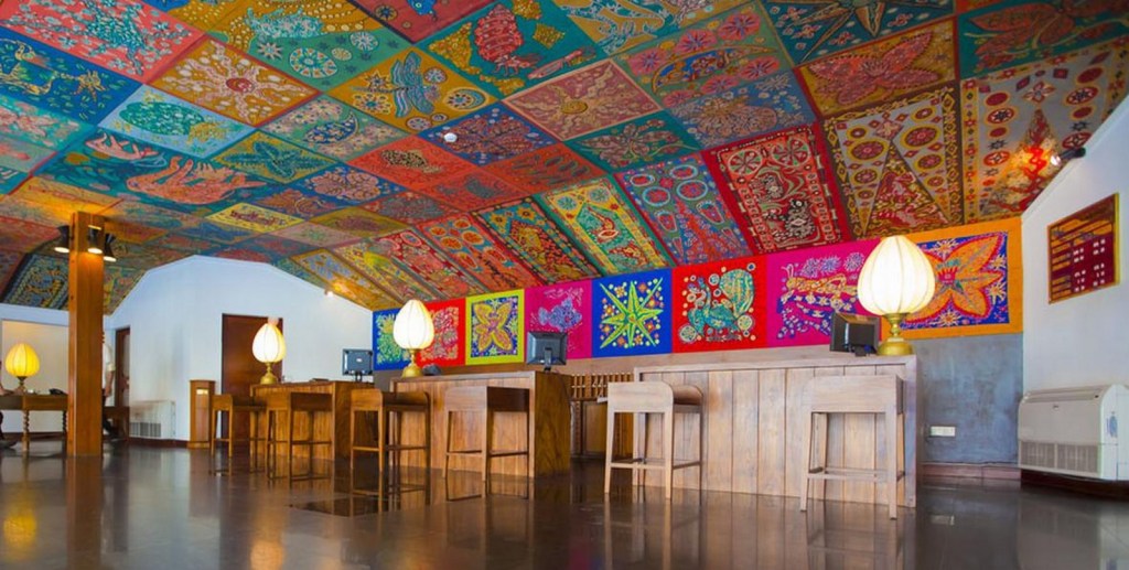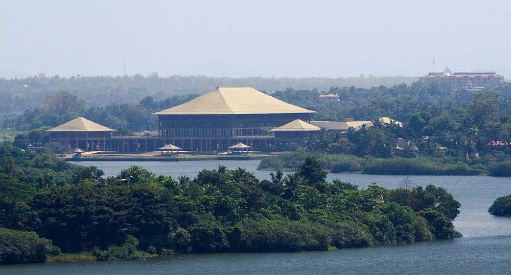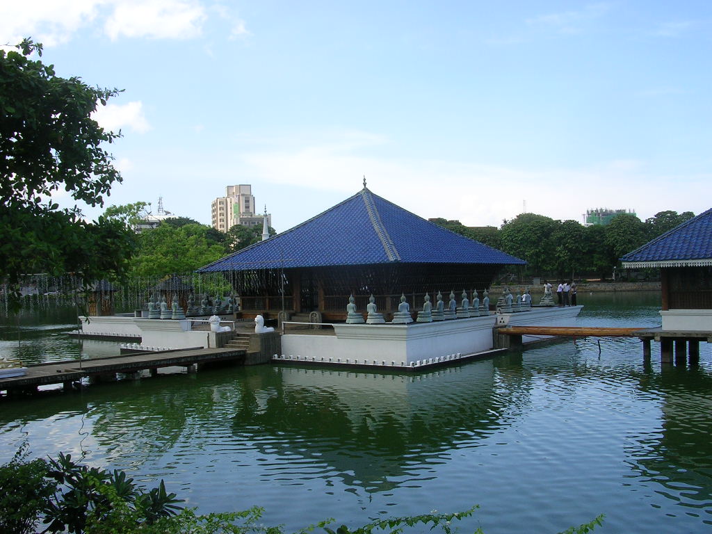 Los tres pabellones de templos budistas de una pequeña isla de Beira Lake, Colombo (1977), con su desbordante construcción en madera y sus tejados colgantes, presentan características y materiales típicos, muy en consonancia con la tradición del país.