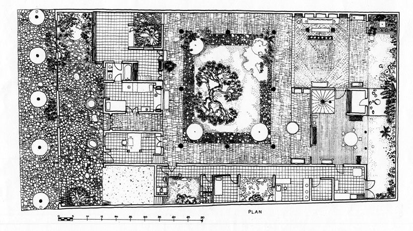 Su arquitectura, que triunfó en su patria, se caracteriza por la exquisita atención que presta al paisaje y a la vegetación.