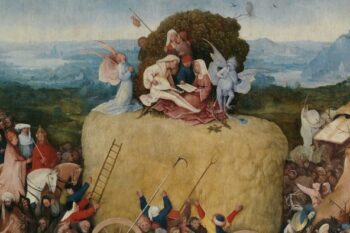 In the central panel Bosch shows humanity dragged along by sin, following behind a haywain, which illustrates the verse from Isaiah 40: 6: All flesh is like grass, and all its glory like the flowers of the field, referring to the ephemeral and perishable nature of earthly things.