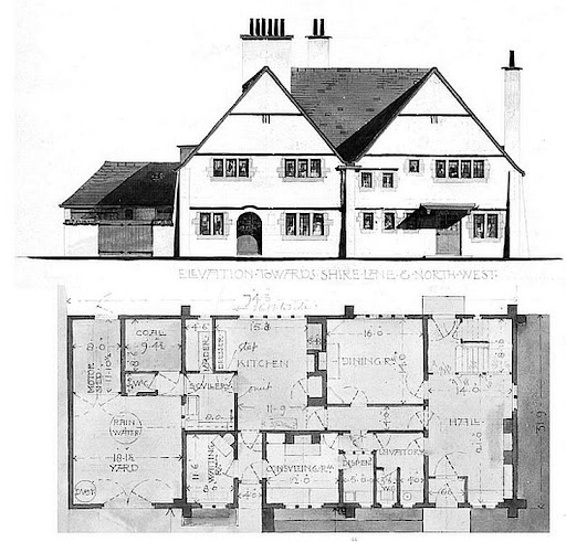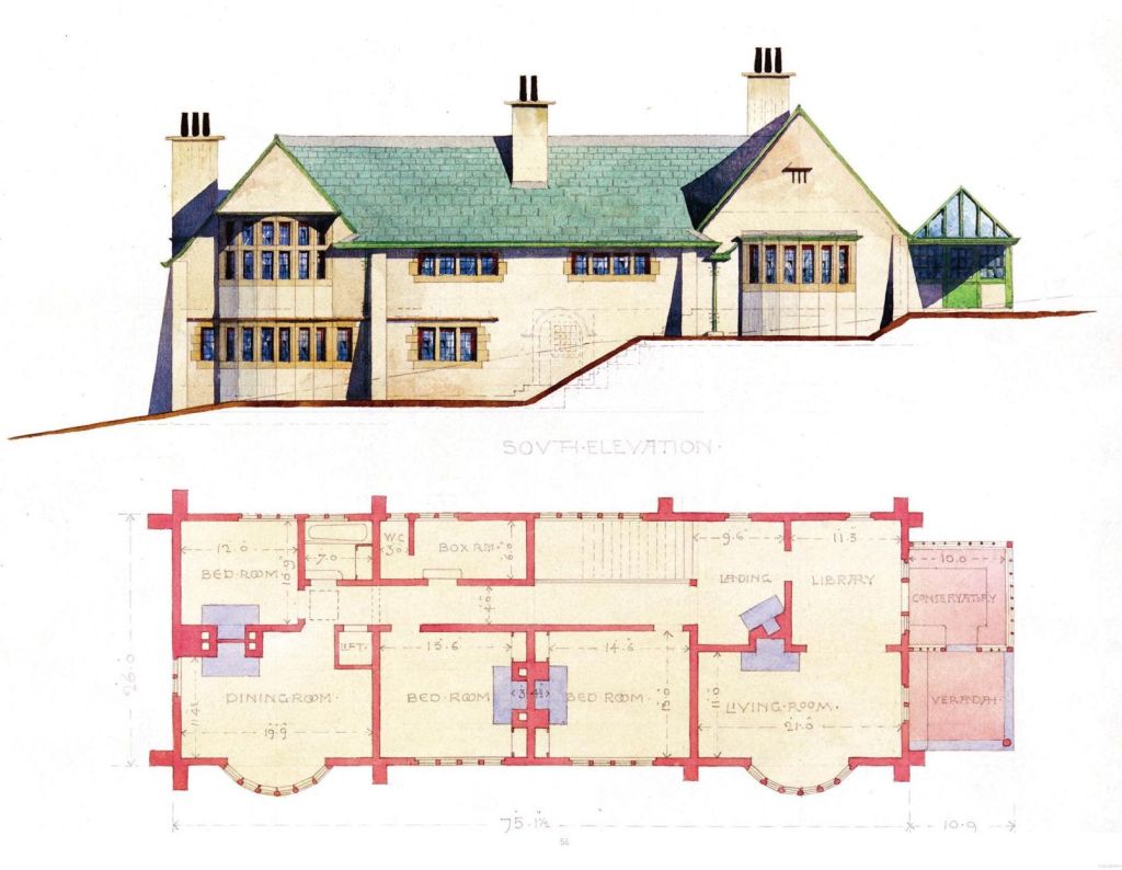 La casa con plano de planta en forma de L muestra los mismos saledizos que la casa Perrycroft, si bien renuncia a los detalles románticos como la torre y las ventanas redondas.