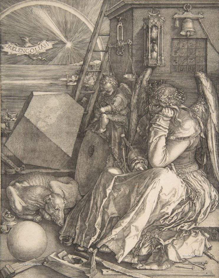 The culmination of Dürer’s engraved work is his so-called three master prints, The Knight, Death and the Devil of 1513, one of the finest images of the Christian knight, Saint Jerome of 1514, the best representation of the Christian intellectual at that time, and Melancholy I, one of the most famous images in history, in which Dürer contributes his idea of the artist as a melancholic figure absorbed in his thoughts.